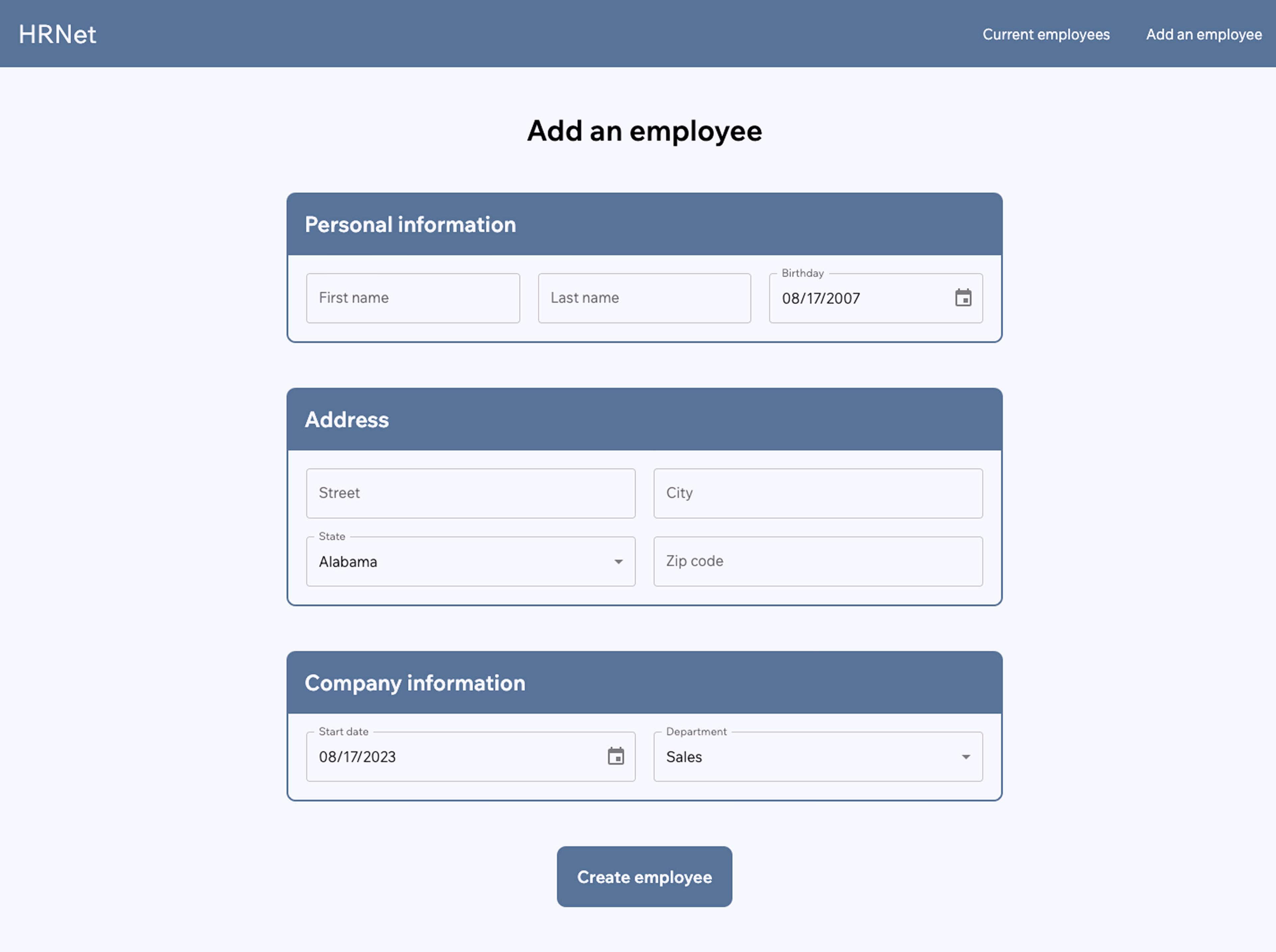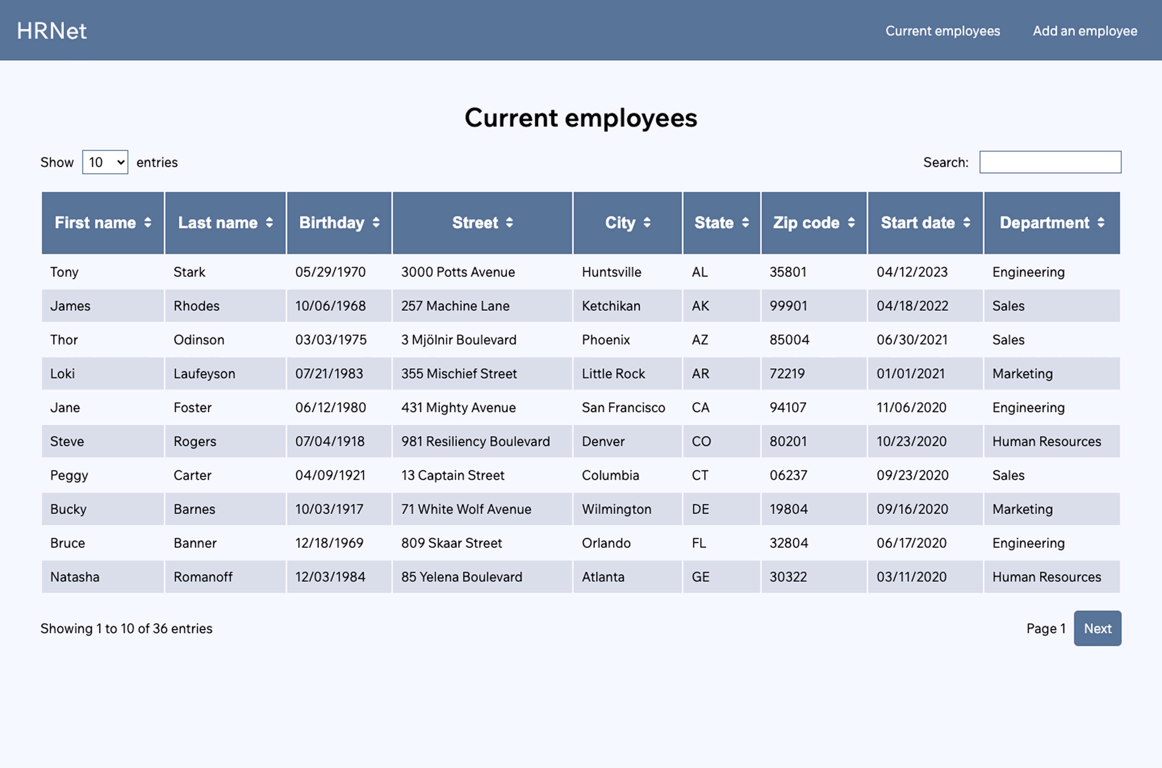 It allows users to add, view, and sort employees through a clean, accessible interface. As part of the project, I developed a custom React table component, later published as an NPM package, supporting pagination, search, and column sorting — all in just 18 KB.