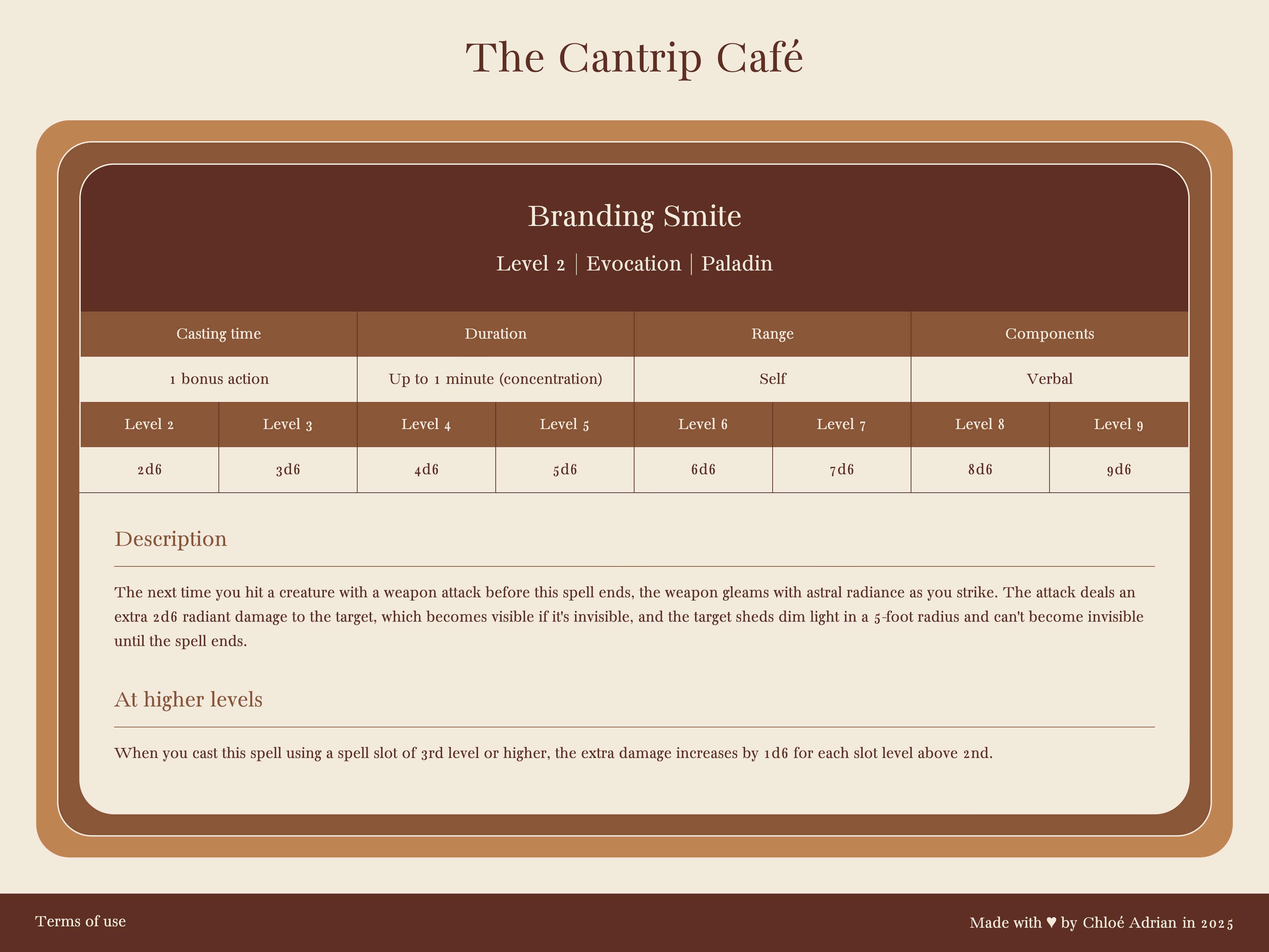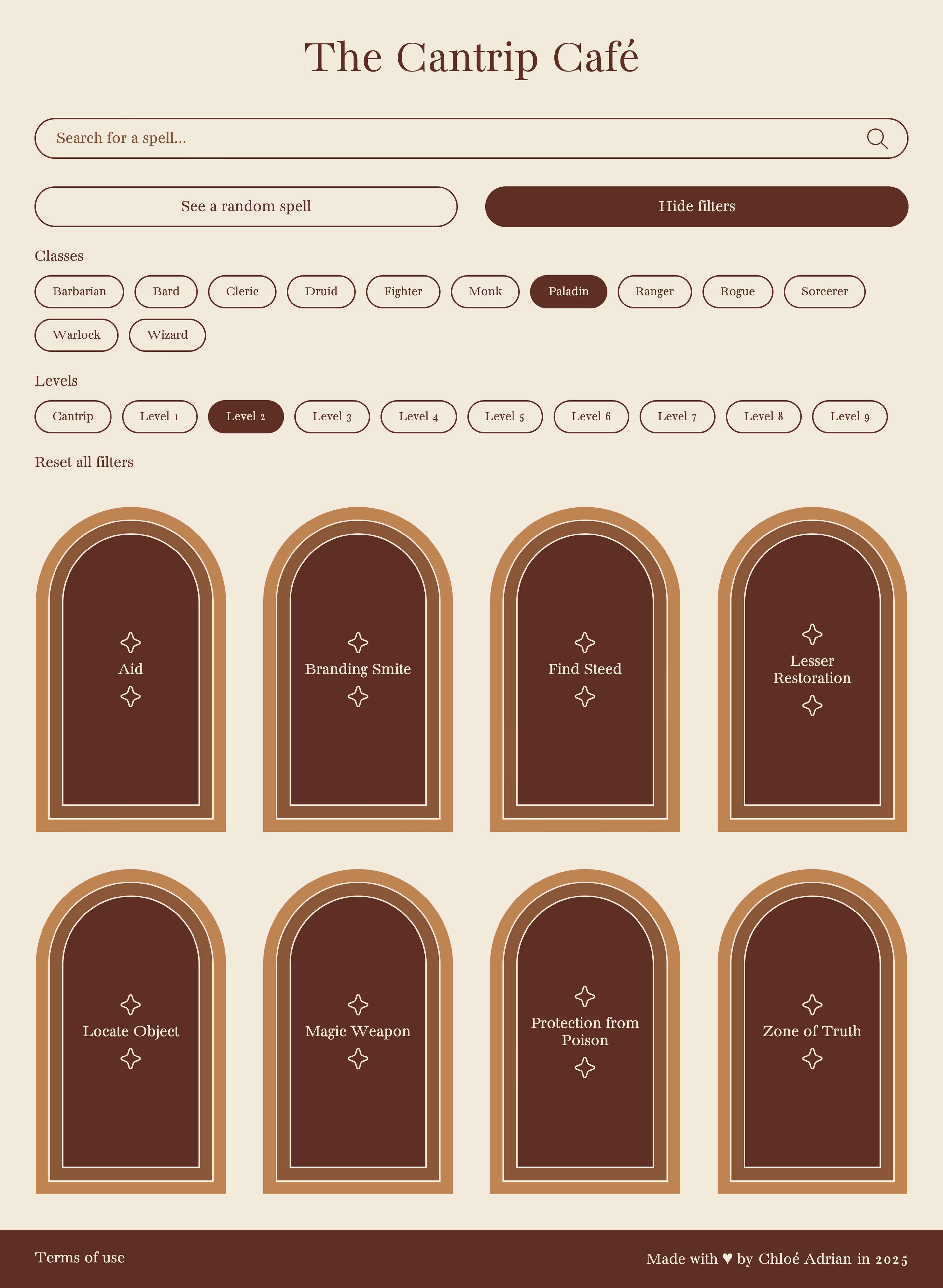 The Cantrip Café is a searchable spellbook for Dungeons & Dragons 5e that I designed and developed from scratch in 2025.